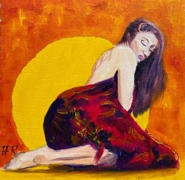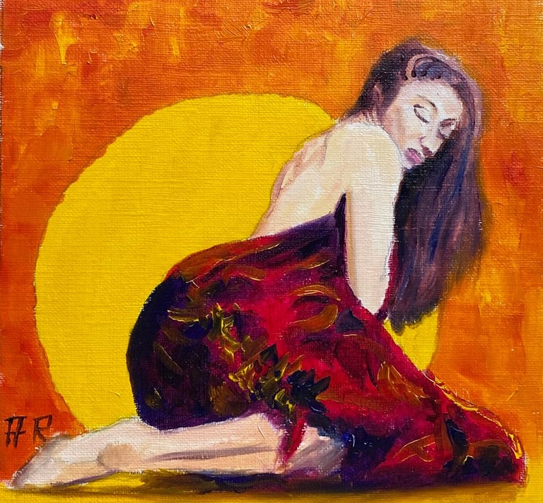 Yesterday I accidently sploged a big bit of Alizuran Crimson on the palatte, so I decided to use that up for this picture, with Cadmium Yellow Light and French Ultramarine. The reference pose was from a photo, and initially I thought a nice big circle behind her might look nice, but after unthinkingly filling it with yellow it obviously looks like the sun, which was not the plan.